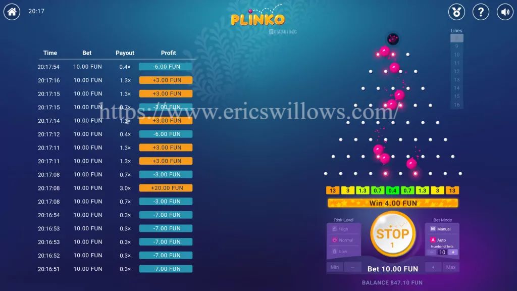 🧮 Mode Otomatis (Auto Bet) — memungkinkan pemain menjatuhkan bola berkali-kali secara cepat.